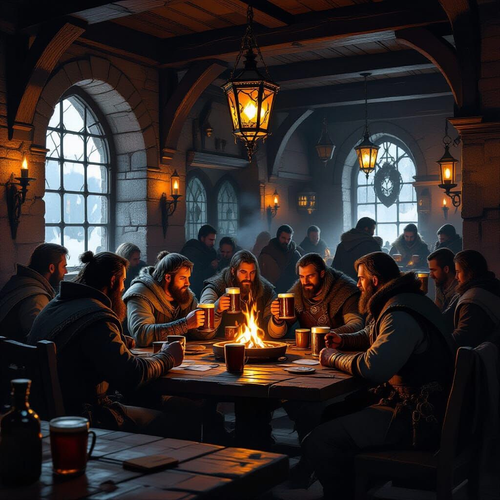 This image showcases a lively medieval tavern, with patrons raising tankards in a cozy, mysterious atmosphere. The scene is illuminated by firelight and oil lamps, presented in a cinematic digital painting style.