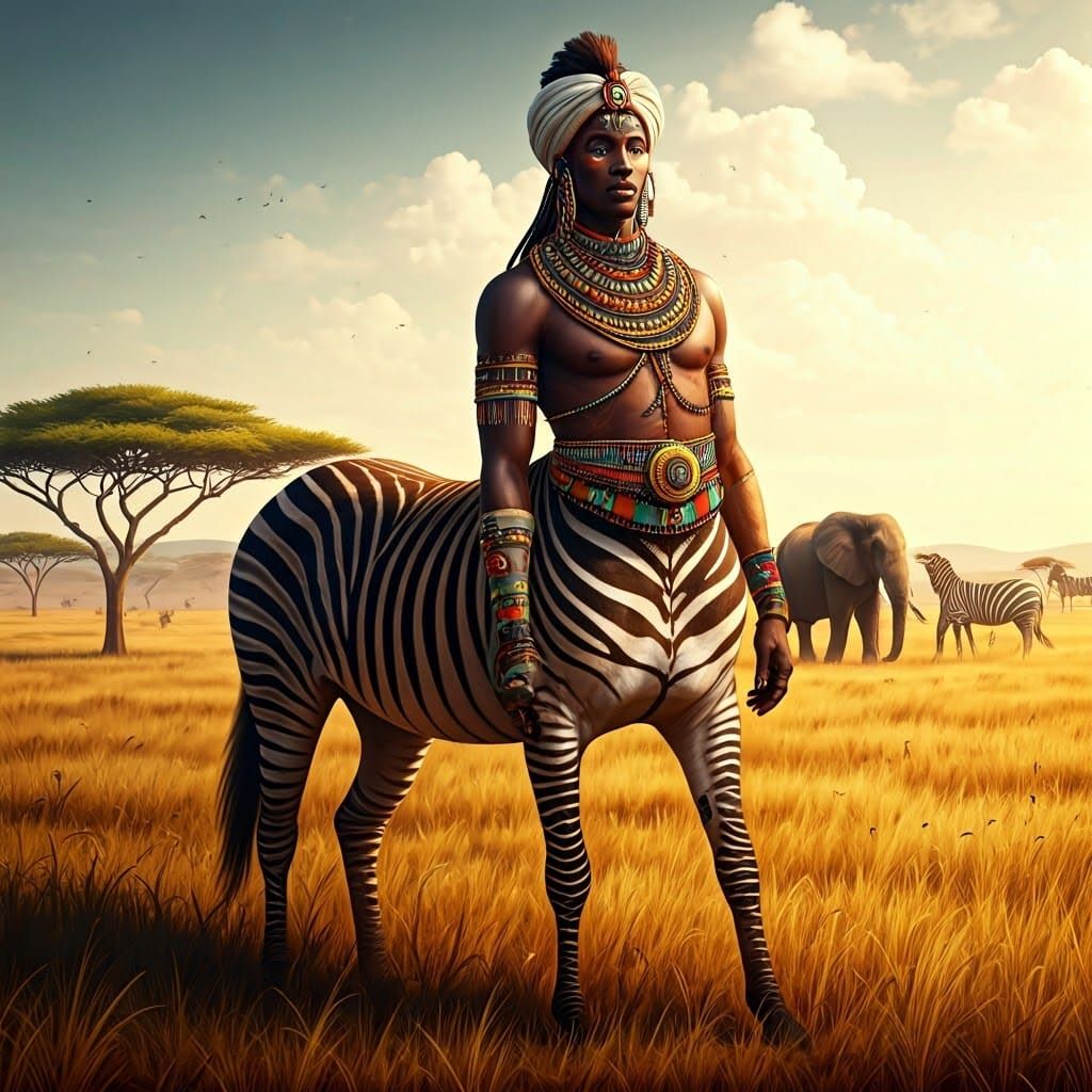 This image shows a zebra-striped centaur adorned with beaded jewelry and a turban, standing in a sunlit savannah. The majestic creature blends African cultural elements with mythological grandeur in a splash art style.