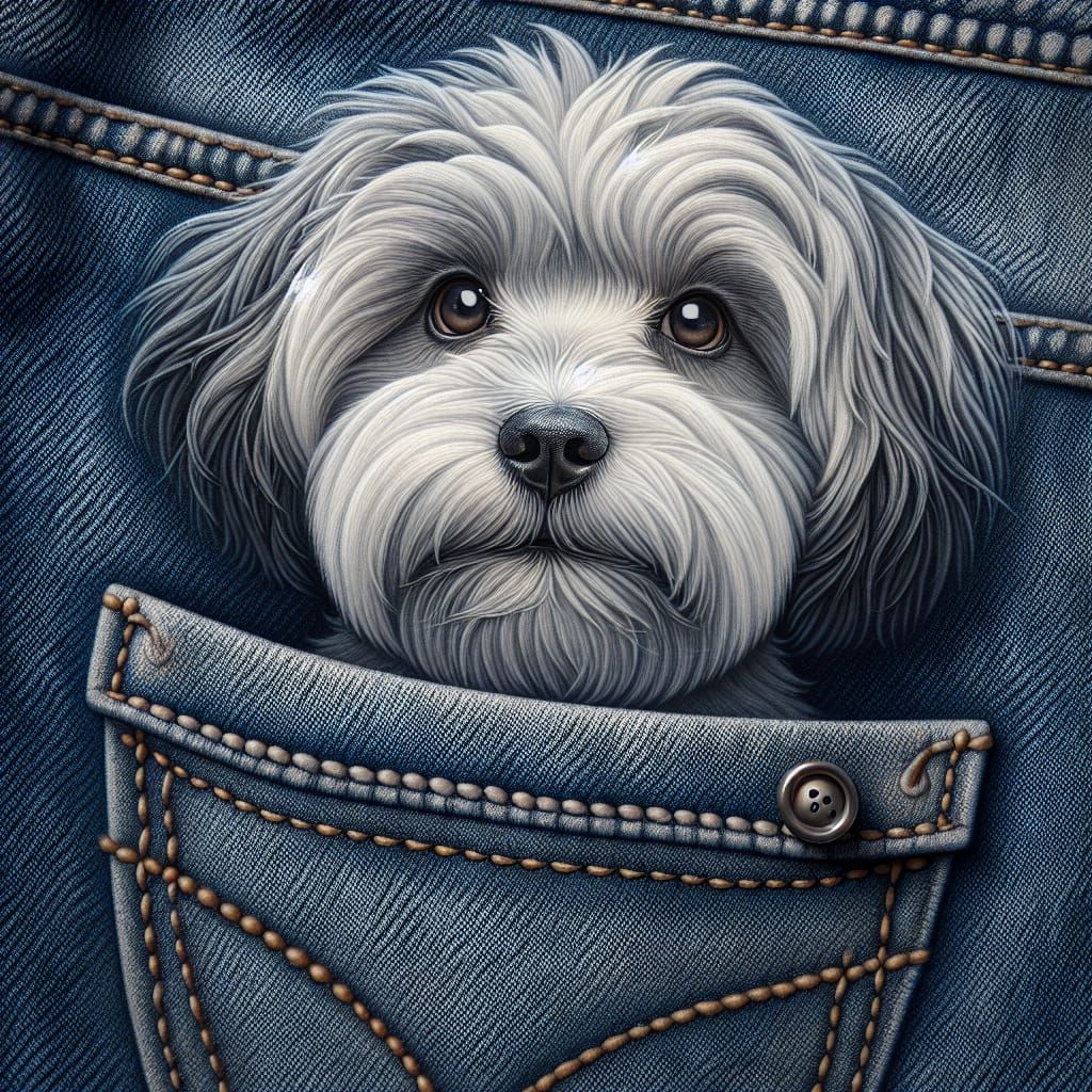 A charming image of a Havanese dog peering inquisitively from a pocket. The dog's soft coat and playful expression are captured in fine detail, set against textured fabric.