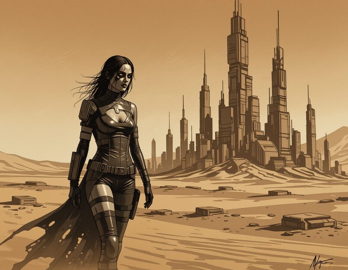 Easily generate unique images of lone women in scorched desert cities or futuristic settlements with our free AI tool.