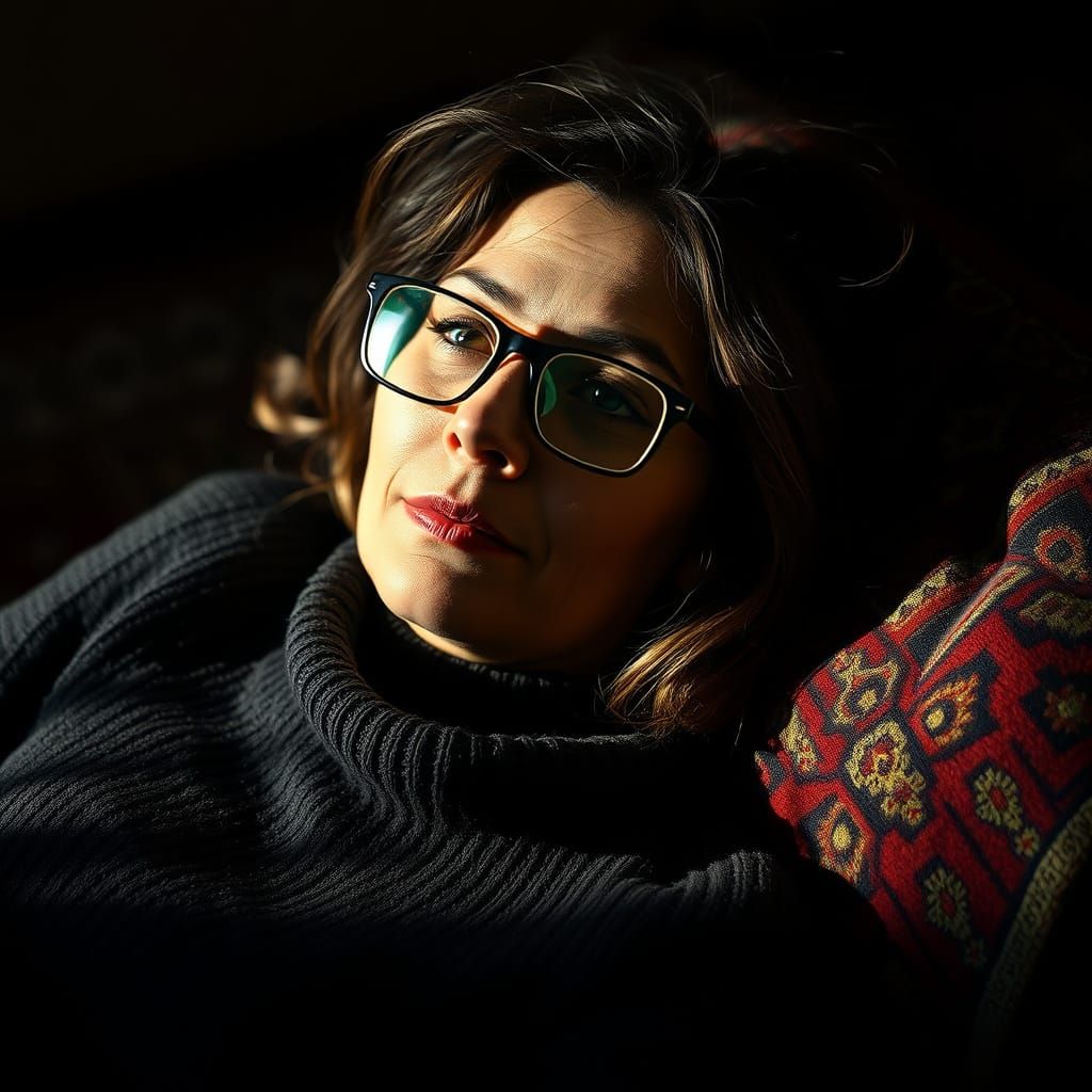This image shows an Iranian woman in repose on a traditional Persian Diwan. The chiaroscuro lighting accentuates her contemplative expression, while impressionist textures define her attire.