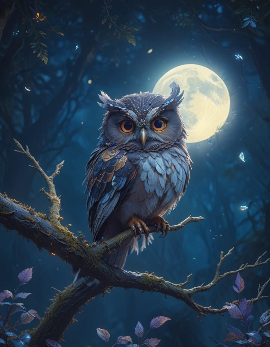 This image shows a majestic bird of prey perched on a misty forest branch, surrounded by vibrant feathers and glowing eyes, set against a warm golden light in a fantasy world.