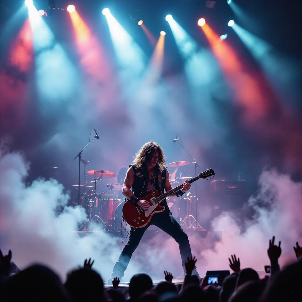 A dynamic shot captures a guitarist commanding a massive stage under colorful spotlights, with ecstatic fans and billowing smoke. The image embodies the raw power of live music, rendered in a vibrant, high-contrast concert photography style.