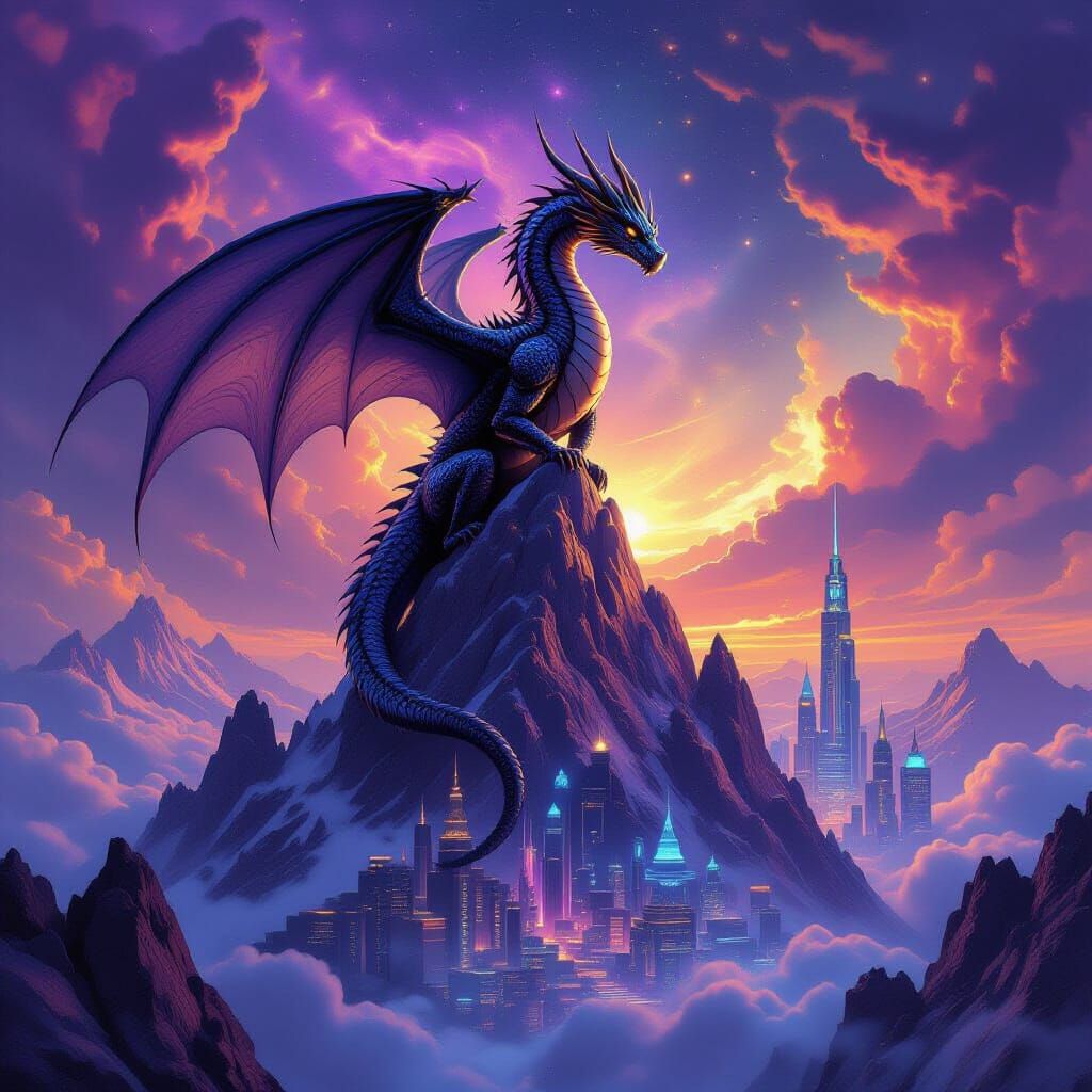 A majestic obsidian dragon rests on a crystal peak above a glowing futuristic city. The sky is a purple and gold nebula. Fantasy art with dramatic lighting.