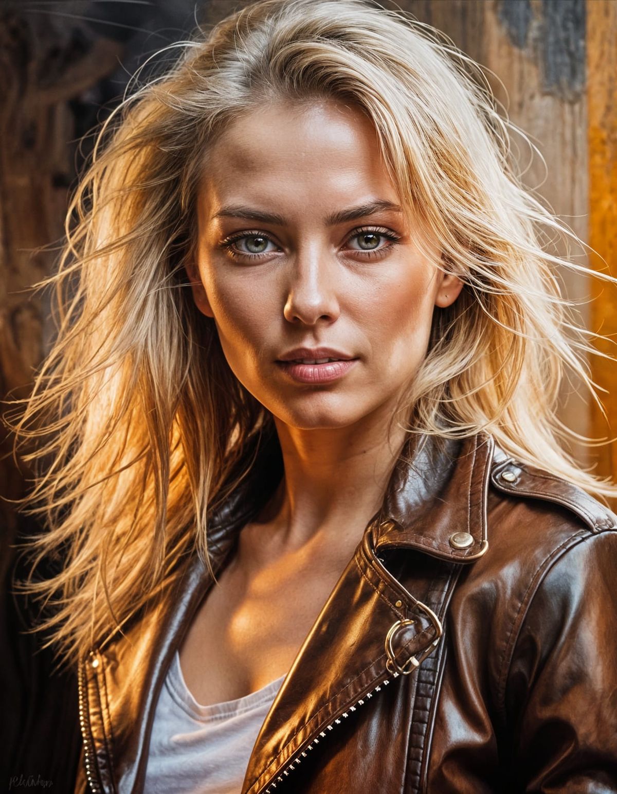 This image features a beautiful woman unzipping her leather jacket. The close-up shot highlights her smile, brown eyes, blonde hair, and lips. She exudes a confident, slightly playful attitude.