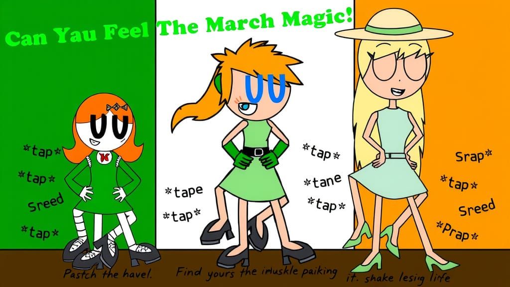 A dynamic image of a woman tap dancing with incredible speed, creating a blur of motion. The artwork evokes classic anime and manga with swirling motion lines and colorful auras.