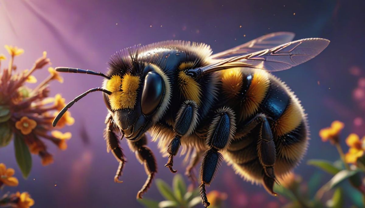 A close-up image of a sleepy bumblebee in flight. The bee's eyes are half-closed and its wings are moving asynchronously, set against a colorful backdrop with dramatic lighting in hyperrealistic detail.