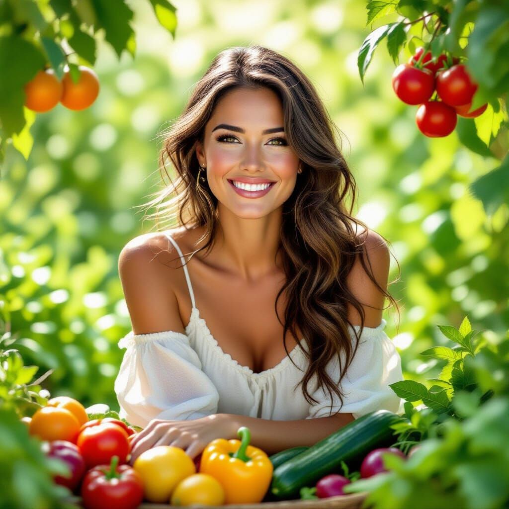 This image shows a vibrant woman in a garden, surrounded by fresh produce. The artwork captures a sense of well-being with soft lighting and textures, in a wholesome and realistic style.