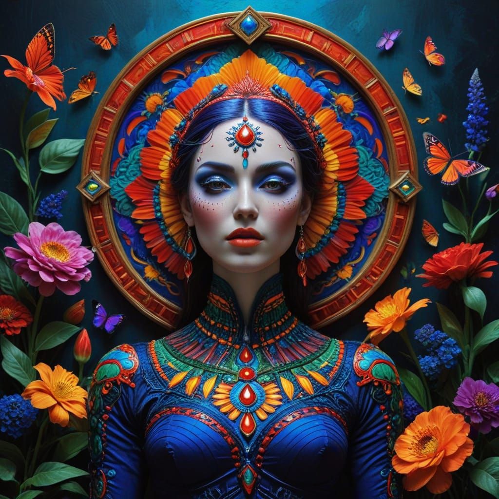 This image showcases a meticulously crafted, breathtakingly beautiful scene in a bold triadic color palette, evoking a sense of drama and atmosphere.