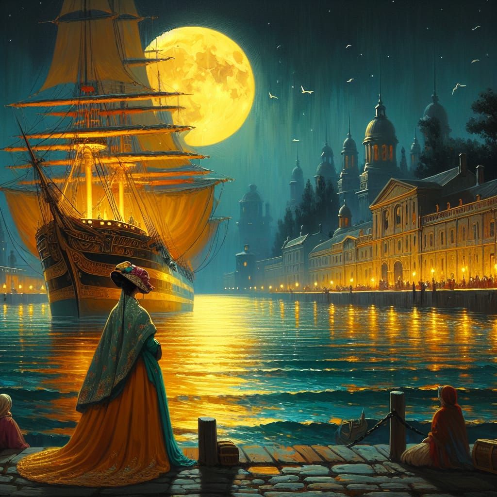 Create a picturesque illustration inspired by the romantic art movement, showing an old city port at night. A yellow moon casts its shimmering glow over the tranquil scenery. Docked at the port is a huge ship, its magnificent size complementing the grandeur of the old city. A woman, dressed in period ...