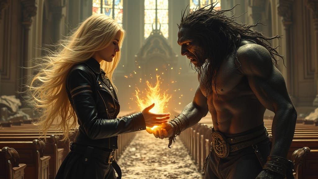 This image depicts a dramatic, cinematic scene of a confident woman facing off against a powerful demon in a ruined church, with a sense of foreboding and anticipation. The artwork is reminiscent of dark, gothic styles and features a striking contrast of light and darkness.