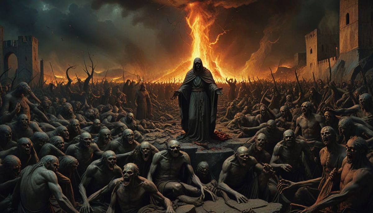 This image depicts a hellscape in the style of Giotto, with tormented souls, demonic figures, and a fiery pit amidst a dark and moody color palette.