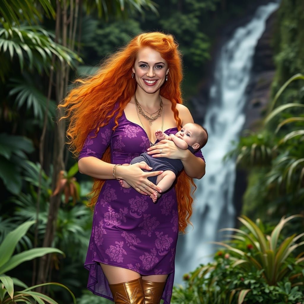 A stunning portrait of a mother in a lush jungle setting, surrounded by vibrant colors and lush textures, with a dramatic flair reminiscent of National Geographic photography and Martin Schoeller's intense portraits.