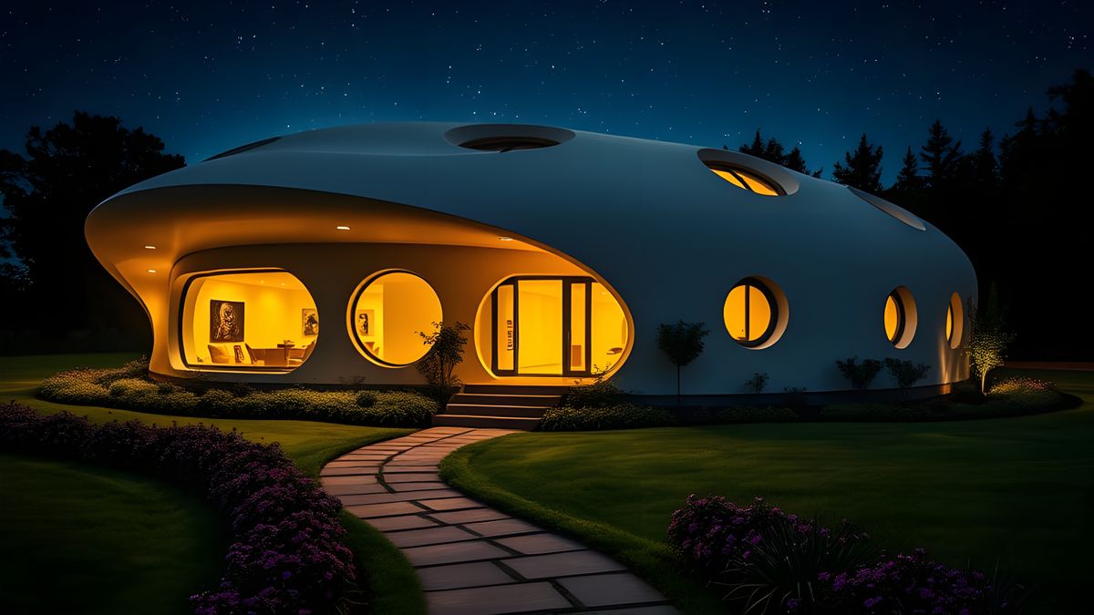 This image is a beautifully rendered, futuristic take on a countryside cottage, featuring a curved exterior with round windows and portholes, set against a dark, starry night sky.