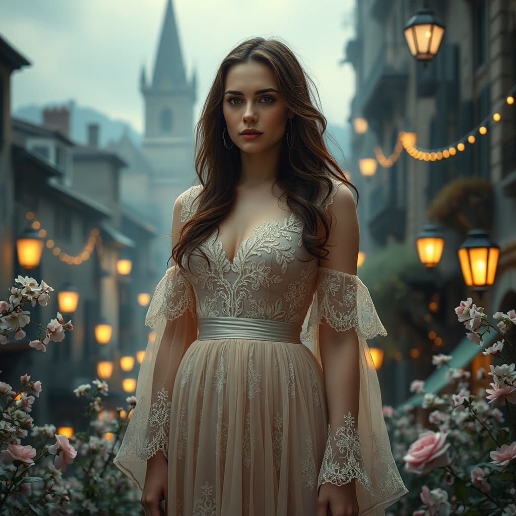 This enchanting scene combines vintage charm with fantasy concept art, featuring Lana Del Rey in a mystical cityscape with delicate flowers, glowing lanterns, and a soft, ethereal glow, evoking a peaceful summer evening.