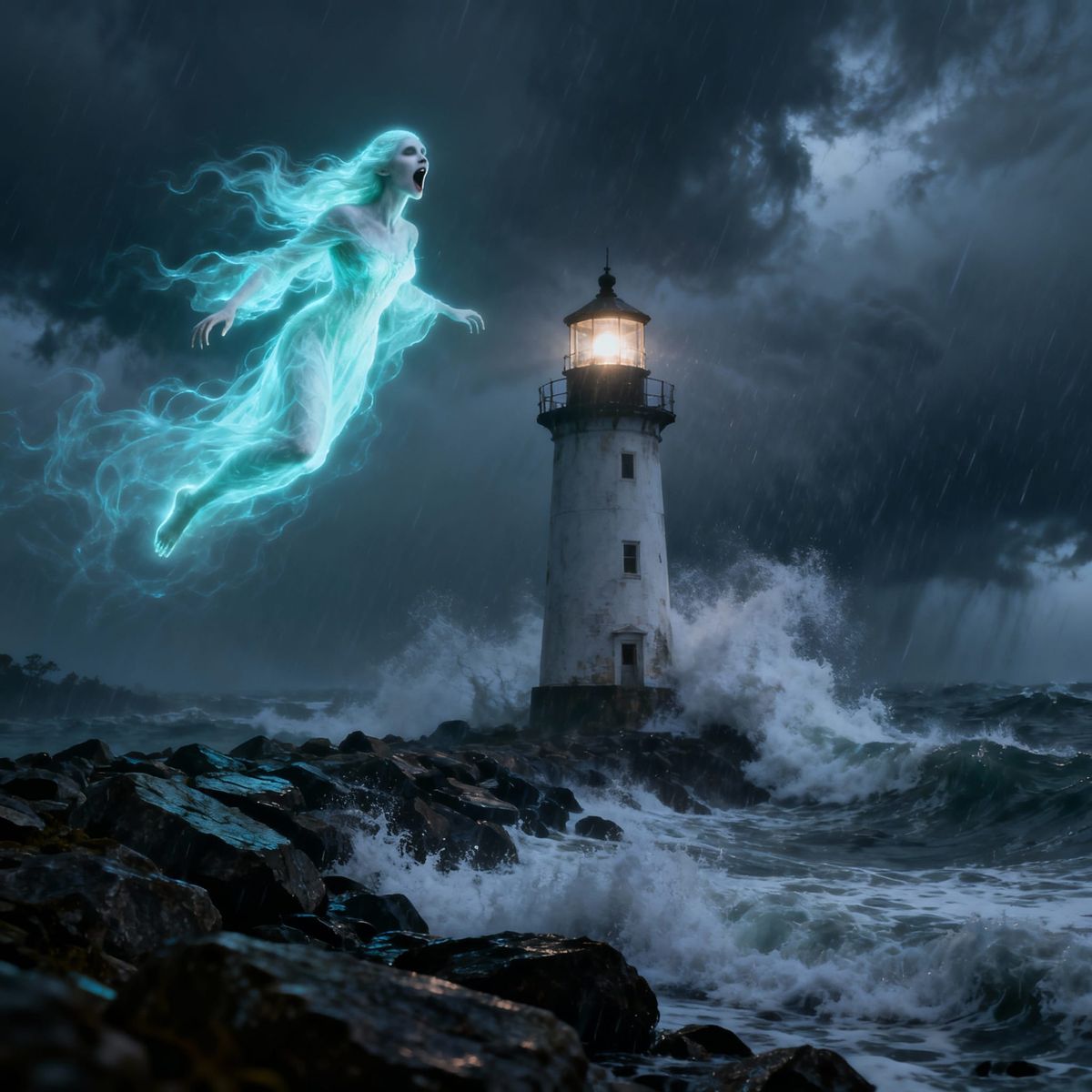 A photorealistic image of a glowing banshee hovering near a lighthouse during a powerful storm. Waves crash against the rocks, with the lighthouse serving as a symbol of hope.