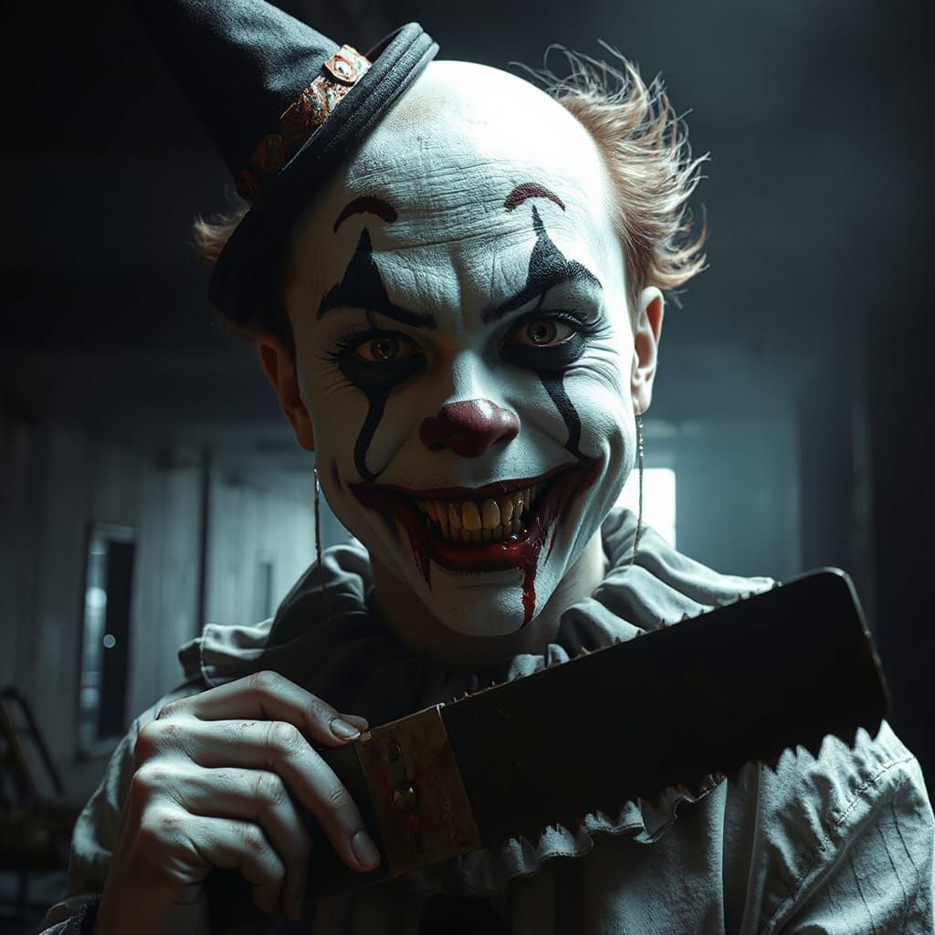 A terrifyingly realistic portrait of Art the Clown holding a bloody hacksaw in a derelict warehouse. The image employs dark realism and intense lighting to enhance the clown's creepy expression.