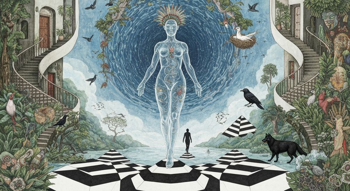 This image shows a bioluminescent figure dancing amidst codes and mystical patterns. The surreal scene evokes themes of ancestral memory, nature, and transformation in a dreamlike, otherworldly style.