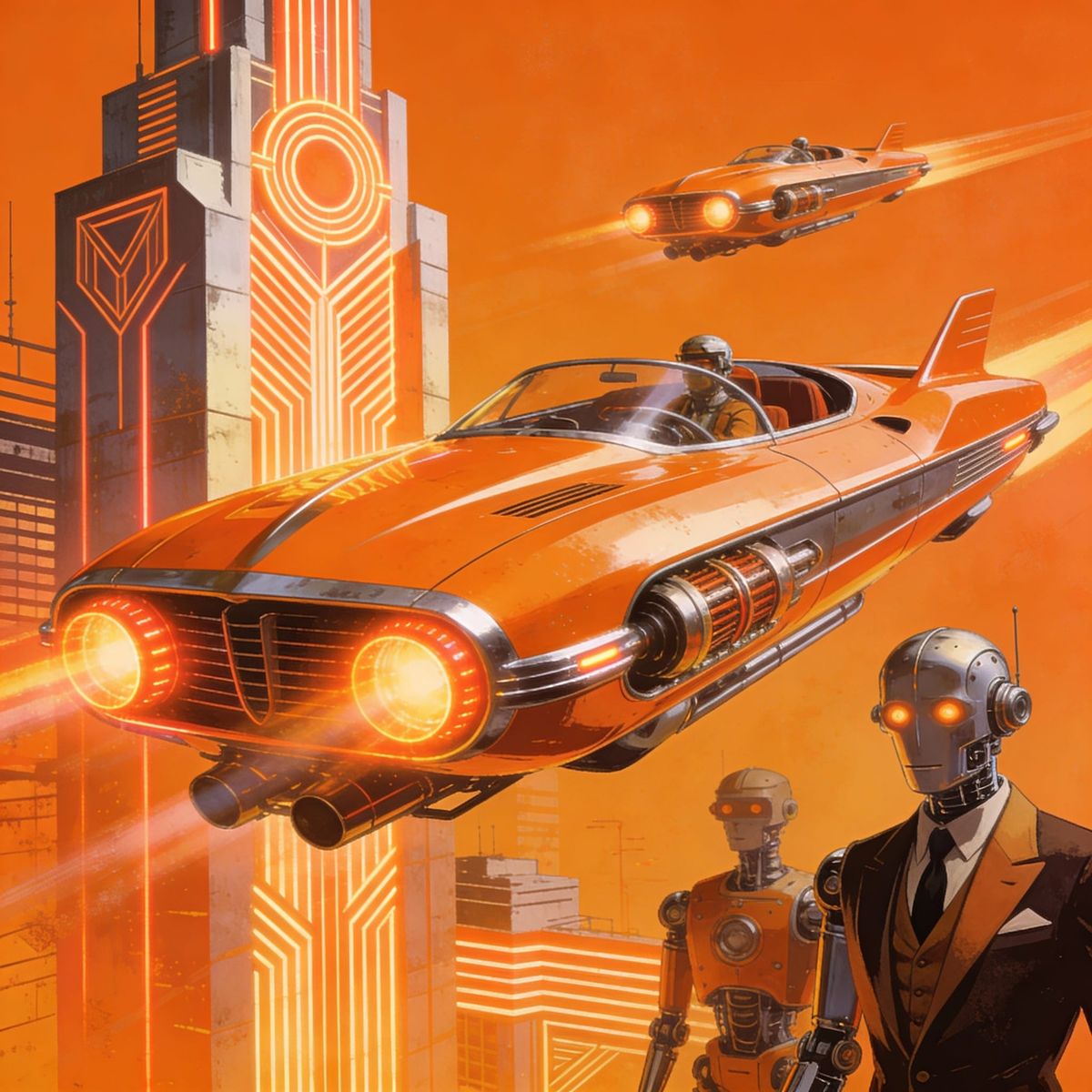 This image showcases a striking retro-futuristic scene bathed in bold, bright orange colors, evoking a sense of nostalgic optimism for the future.