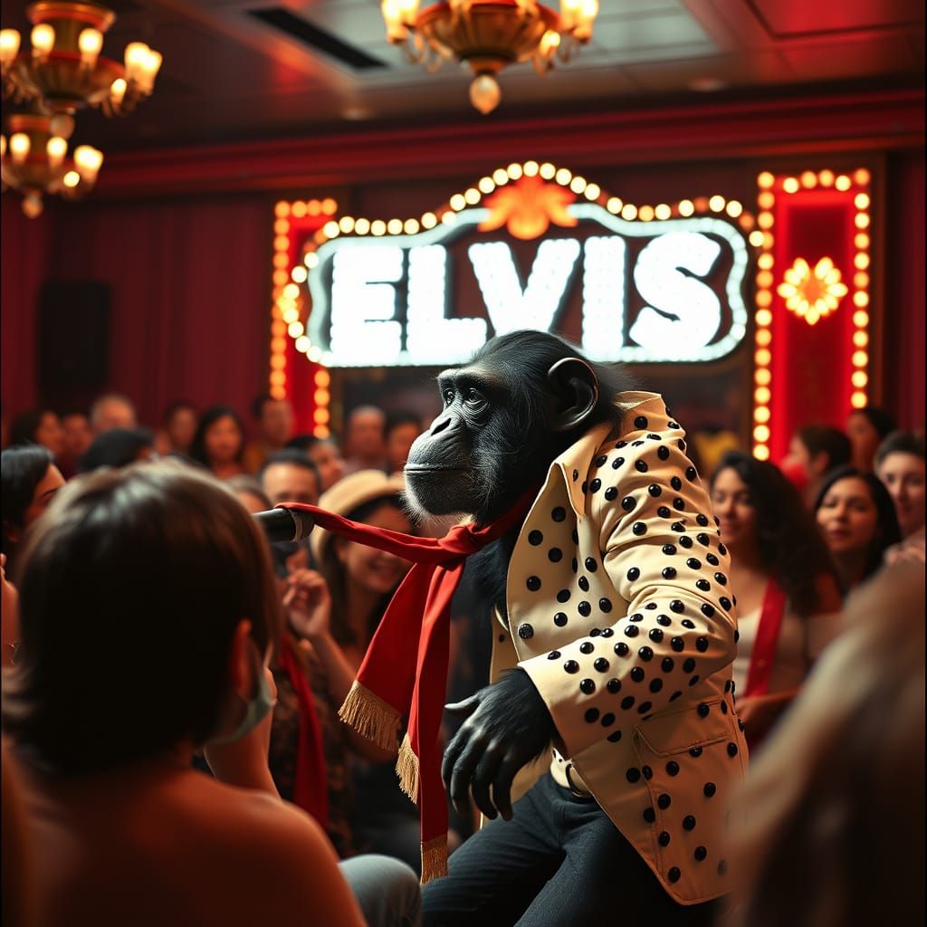 This image shows a chimpanzee impersonating Elvis Presley on a Las Vegas stage. The audience is captivated as the chimp hands out scarves. The image has a humorous tone.
