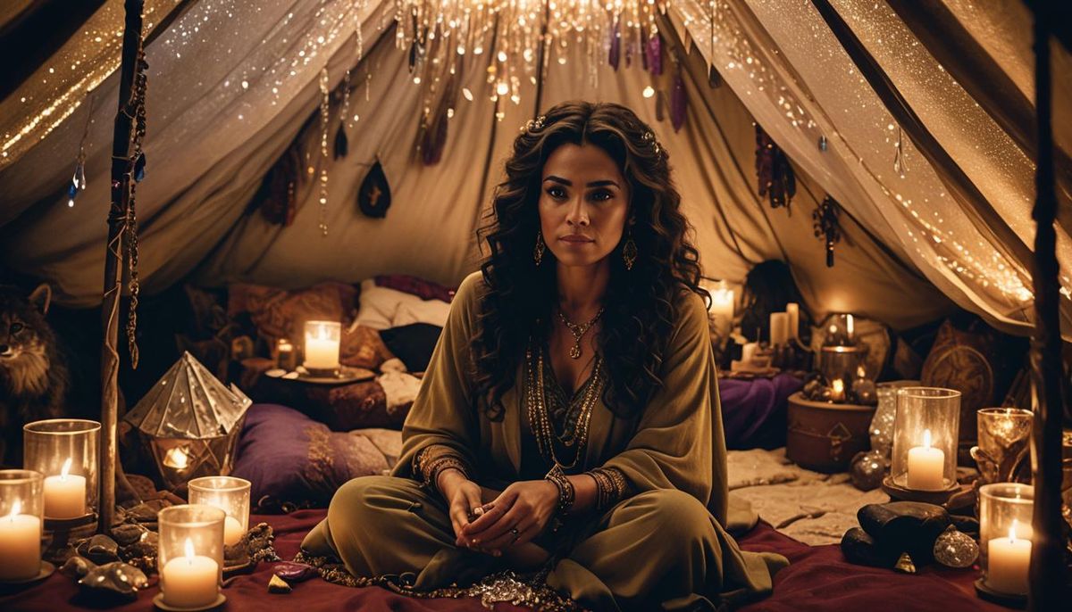This image shows Esmeralda in her tent, surrounded by mystical artifacts. Soft candlelight illuminates her face and the red and gold embroidery of her robe, creating an enchanting, cinematic ambiance.