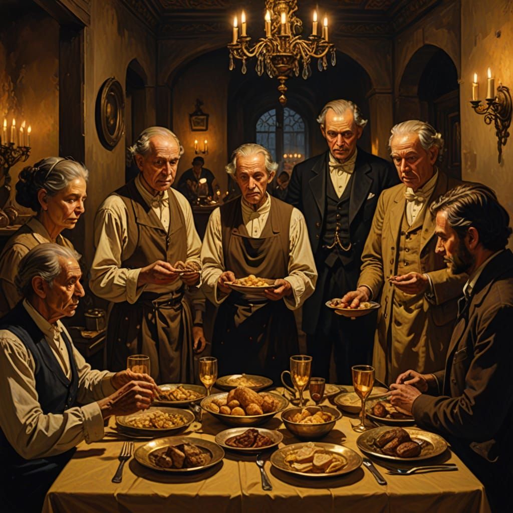 This image shows a stark contrast between poverty and wealth. Gaunt, starving servants in tatters offer food to the ultrarich in fine clothes. The scene is lit by flickering candlelight, in an oil painting style.