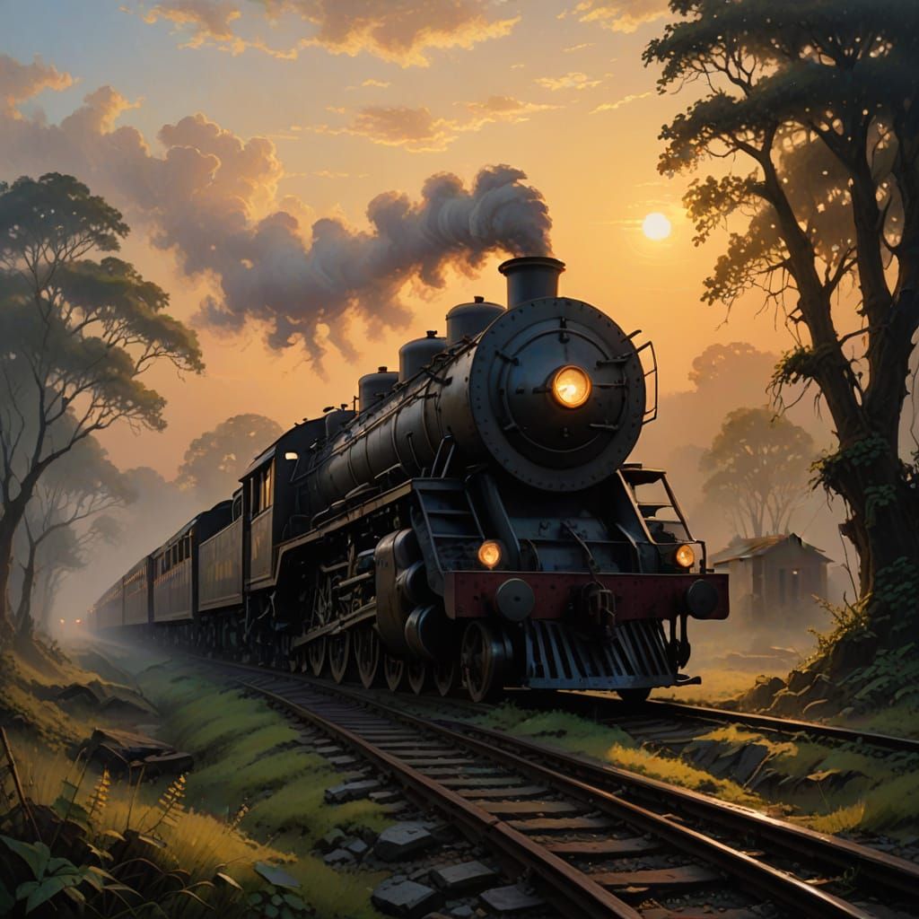 This atmospheric landscape painting depicts ancient ruins of a forgotten world at sunset, with mist clinging to structures and a lone locomotive on overgrown tracks. Evokes a mood of peaceful melancholy and mystery.