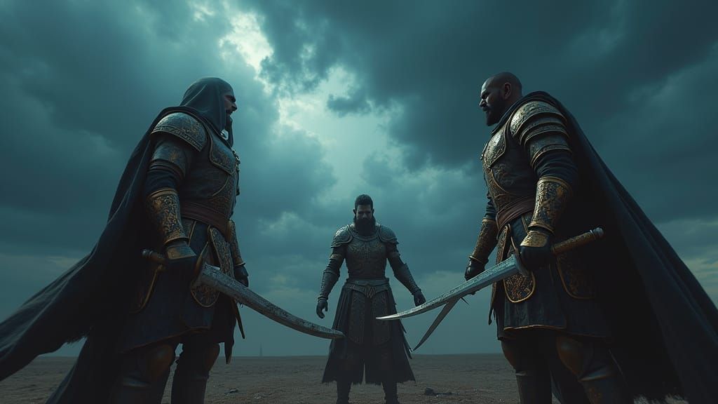 This image depicts three warriors, Rana Sanga, Prithviraj, and Jaymal, in a tense standoff on a vast, barren battlefield. The dark, ominous sky and flickering light cast long shadows, accentuating the intricate textures of their armor and the curves of their drawn swords.
