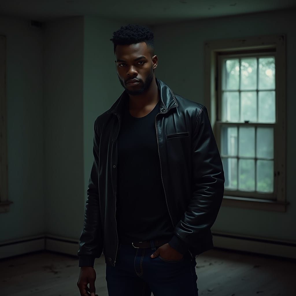 This image captures a lone figure standing in a dimly lit, abandoned space, illuminated by the soft glow of moonlight. The atmosphere is tense and moody, with a blend of realism and cinematic flair, reminiscent of high-contrast lighting and emotive brushstrokes.