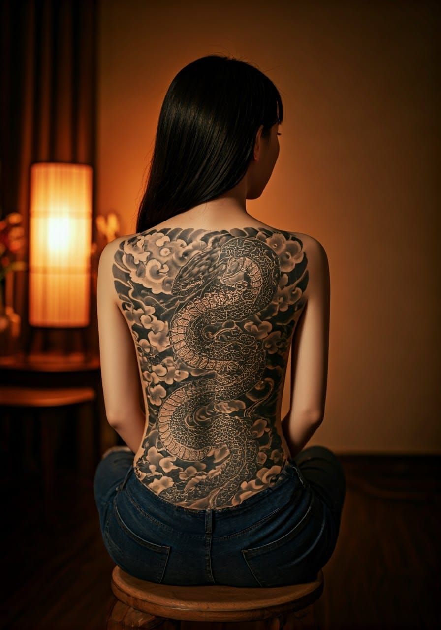 A photorealistic image showing a young Chinese woman in a warm-toned room. She has an intricate black tattoo of a mystical snake on her back, rendered in a traditional Chinese style.