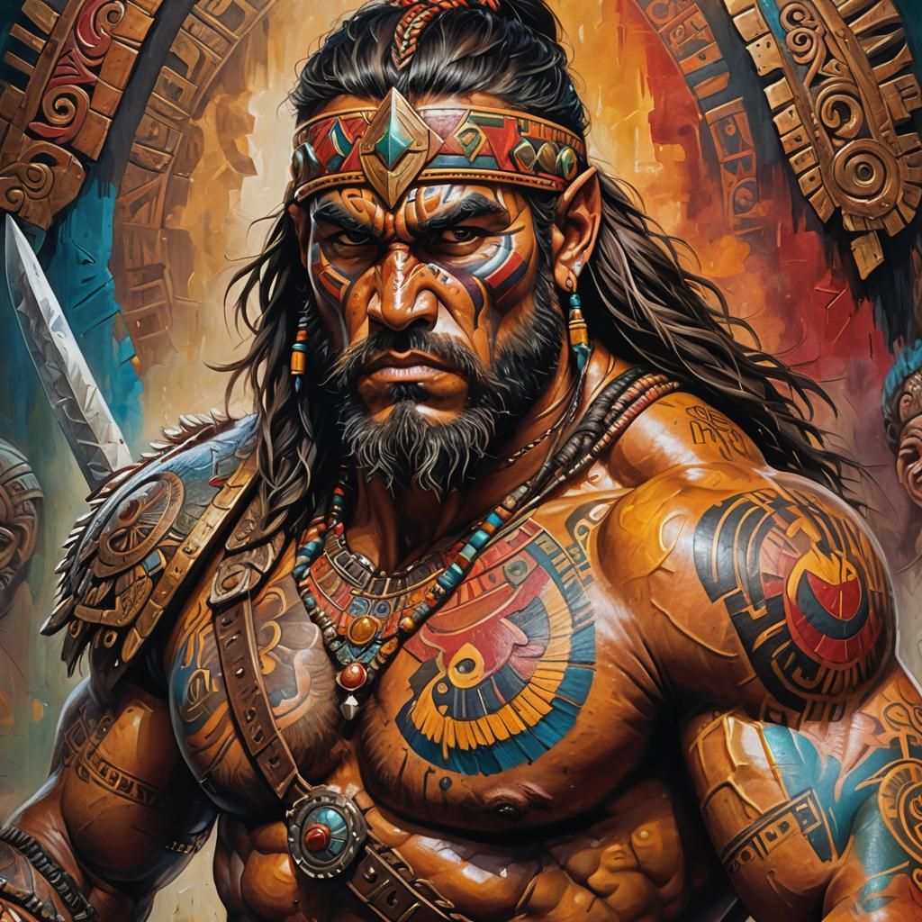 A close-up oil painting of a muscular barbarian warrior intensely focused on a plumb line. Inca-inspired tattoos in vibrant colors adorn his body in this dynamic mixed media collage.