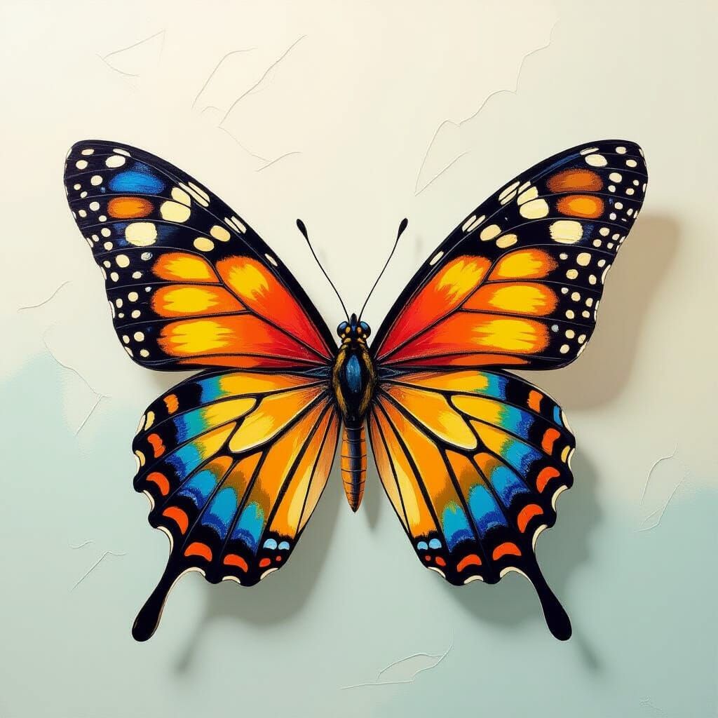 A striking picture of a vividly colored butterfly with detailed wings. The image evokes lightness and grace, reminiscent of impressionist and romantic fine art styles.