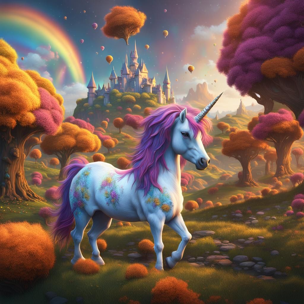 This image shows a unicorn pony with the Lorax riding on its back. The digital painting features intricate details, deep colors, and a fantastical concept, rendered in 8k resolution.