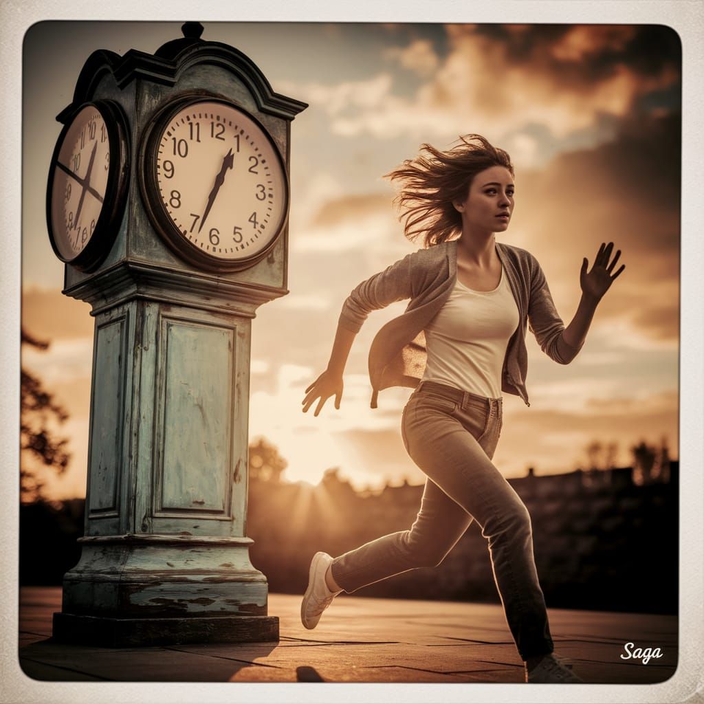 This image shows a young woman in a state of urgency, running past a beautifully lit clock tower. Soft golden light and gentle shadows add a sense of beauty to the scene, set against a vibrant sunset backdrop.