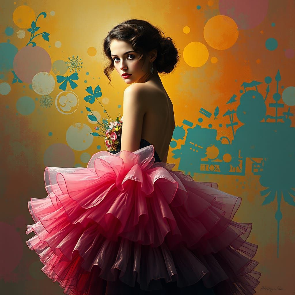 A pin-up style portrait of a woman in layered petticoats. The hyperrealistic image features intricate details, dramatic lighting, and a colorful backdrop, rendered as concept art.