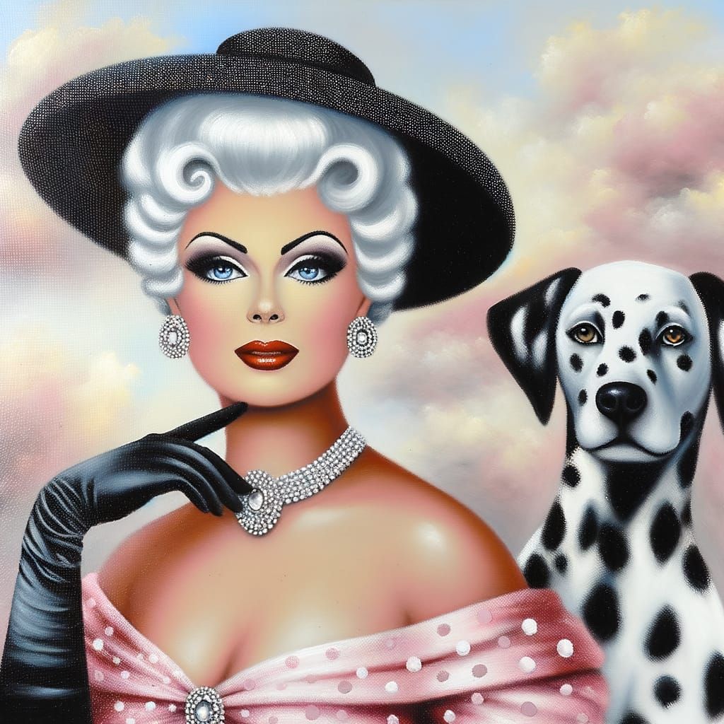 An elegant vintage woman of Middle-Eastern descent with platinum blonde curls poses with a Dalmatian dog. This oil painting captures timeless glamour with vivid brush strokes and warm lighting.