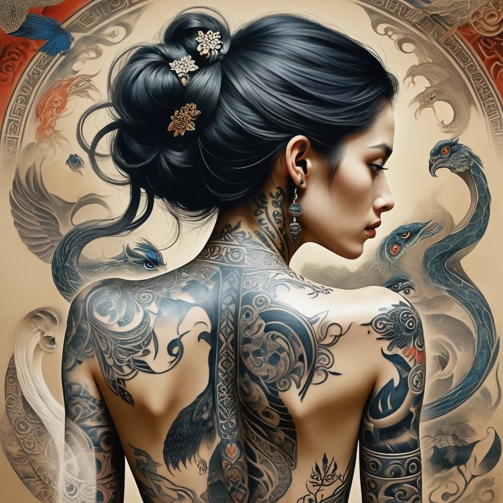 A captivating image of a slender woman adorned with mysterious tattoos. The artwork evokes a sense of ancient wisdom through fine details and vibrant, opalescent colors. The image has a fantasy concept art style.