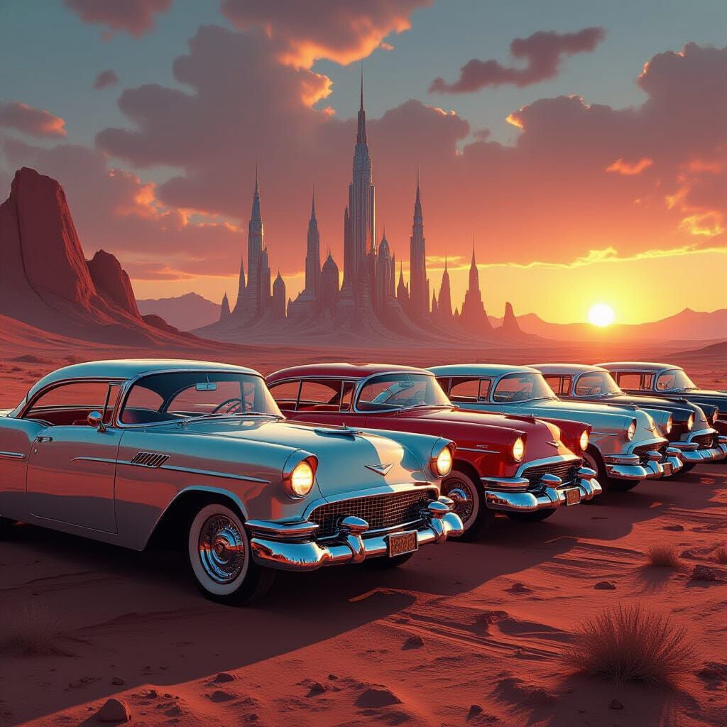This image shows a fleet of vintage cars with chrome plating and glowing exhausts on a dusty alien planet. A fantastical city rises behind them under a binary sunset, captured with cinematic lighting in a hyperrealistic matte painting style.