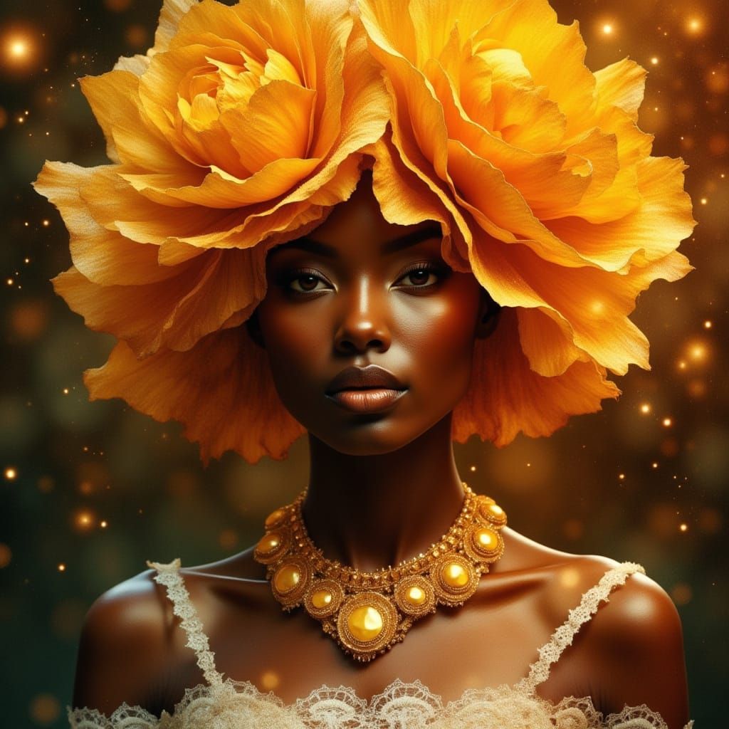 <lora:FLOWERY:1.0> <lora:DreamweaverFlux:1.0> <lora:Flax:1.0> A 3/4 face of à goddess very alluring african woman, with vibrant orange, a hat with yellow double roses transforms in fine white LACE and yellow necklace, Dewdrops cling to the petals. Night light illuminates , golden stars and splash ...