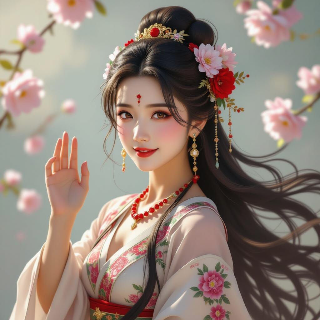 A hyperrealistic portrait of a serene Chinese warrior princess with flowers in her hair and ruby jewelry, set against a vibrant, color-splattered backdrop with cinematic lighting.