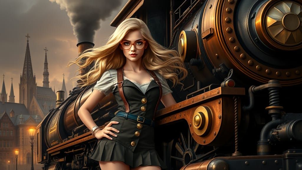 This captivating steampunk portrait features a young woman with golden locks and brass-rimmed glasses, leaning against a majestic steam-powered locomotive in a rich, muted cityscape with Gothic spires and industrial smokestacks.