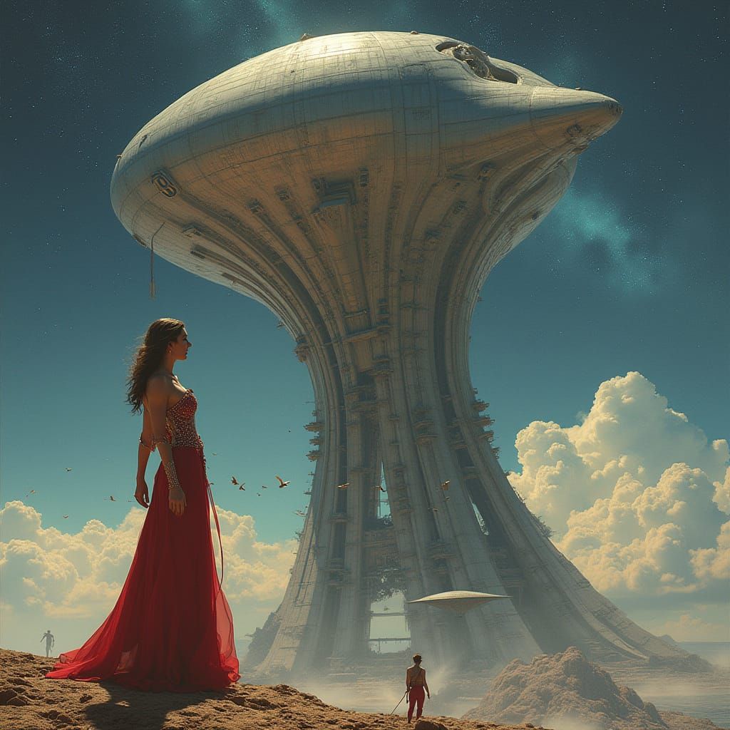 Uma linda mulher em uma mega espaçonave colossal paira, suas enormes dimensões refletindo a luz das estrelas. A espaçonave, com sua imponente estrutura e painéis metálicos, ostenta em sua superfície, nas cores vermelhas e azuis góticas, a inscrição "BG", imponente e misteriosa. As tripulações a bordo, ...