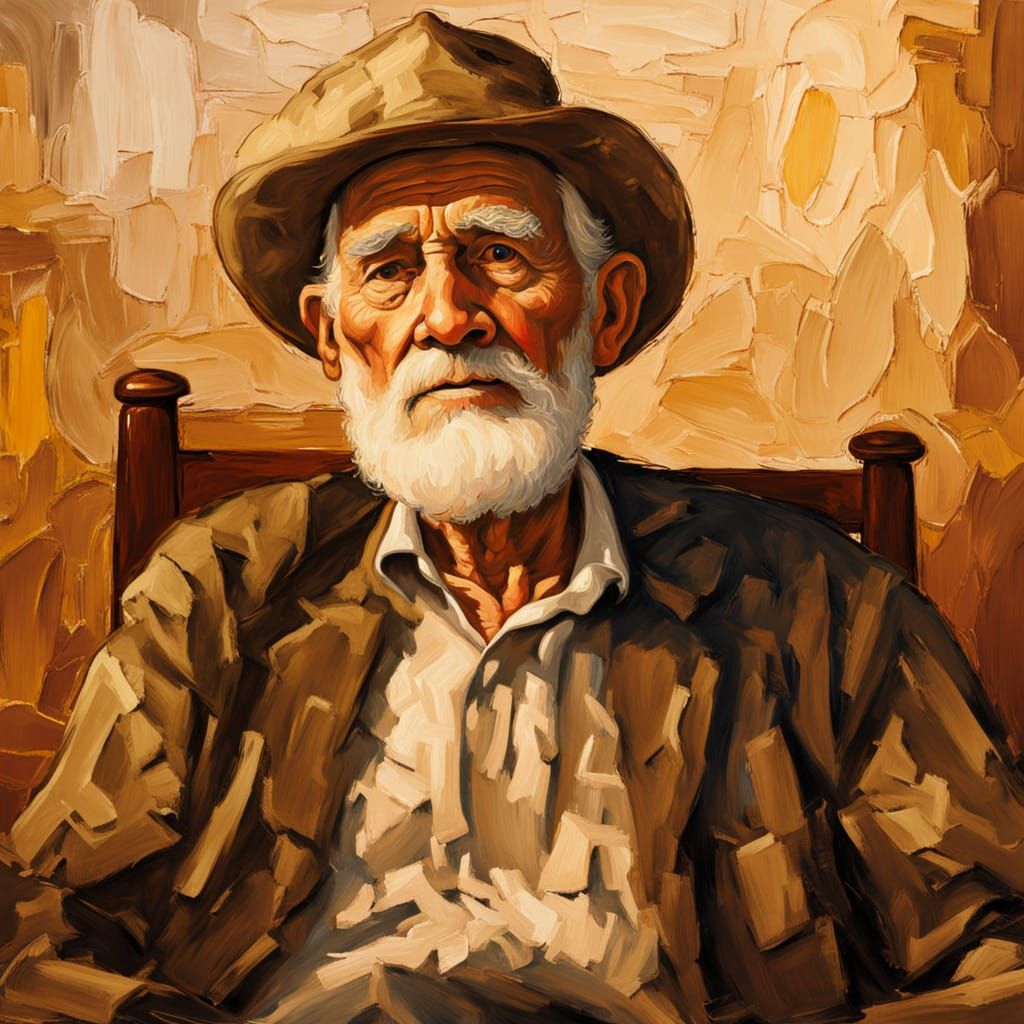 This image shows a close-up, medium shot oil painting of an old man sitting in a chair. It features thick, textured brushstrokes and a vibrant, warm golden palette in an expressive, neo-impressionist style.