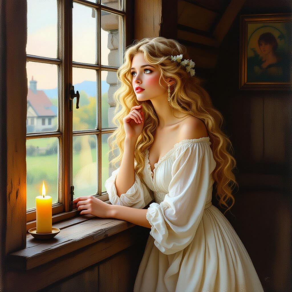 A dreamy image of a blonde woman in a white dress gazing out of a window in an old house, with a candle flickering nearby. The image has an art nouveau aesthetic.