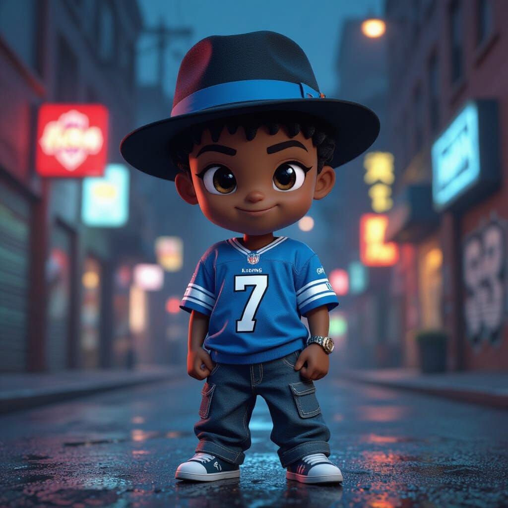 This image features a young Black boy in a Detroit Lions jersey and fedora, set against a neon-lit Detroit street. The art style is 3D anime with ultrafine detail and breathtaking lighting.