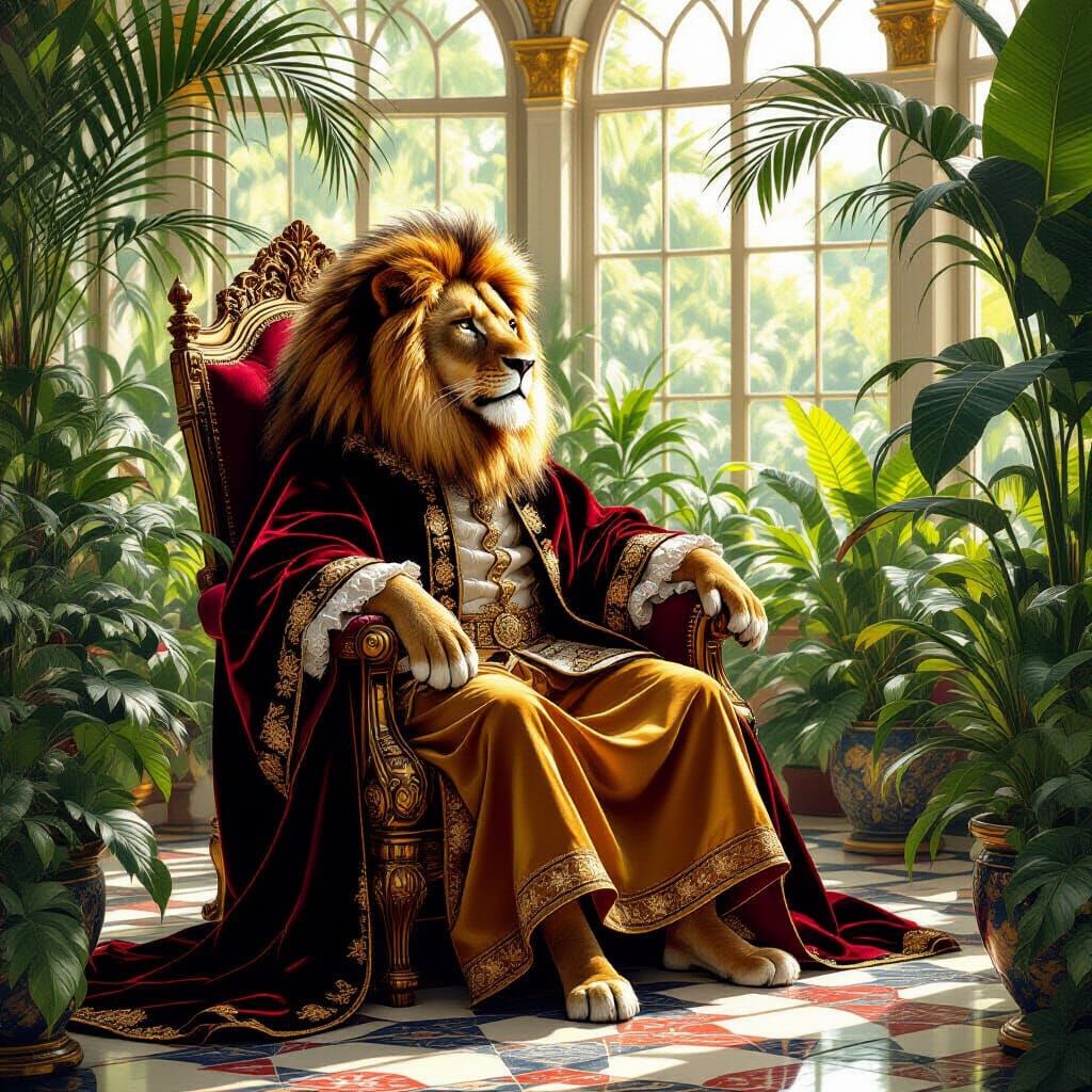 A striking picture of a lion wearing a robe, sitting on a throne in a sunlit greenhouse. This image is an AI generated artwork in the style of classical portraiture.