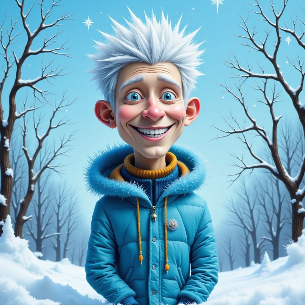 This image shows a happy, tall, thin man with white frosty hair adorned with icicles. He wears a light blue winter jacket during a colorful, detailed winter storm.