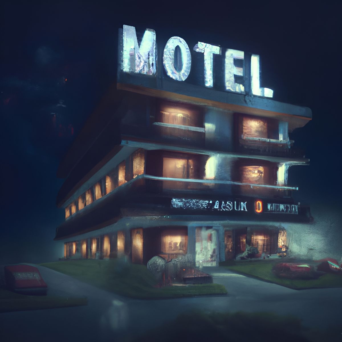 A digital matte painting of a creepy motel. The image is cinematic and highly detailed, with dramatic and atmospheric lighting to enhance the maximalist aesthetic.