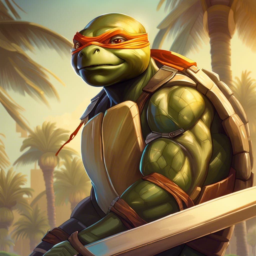 A digital portrait of Michelangelo from the Teenage Mutant Ninja Turtles skateboarding with palm trees in the background. The character is rendered with dynamic lighting and intricate details.