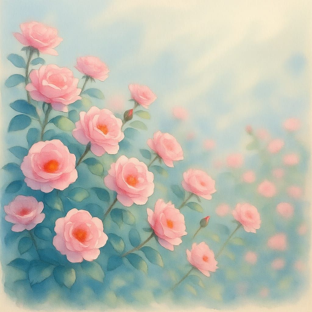 This image shows a side view of a garden filled with pale pink roses. The blossoms blur into a soft blue background, creating a misty, dreamlike atmosphere in an anime art style.